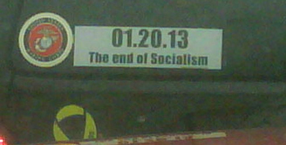 What is this mysterious bumper sticker on this mysterious vehicle featuring at least two (2) other mysterious bumper stickers? Wonkette operative Garrett Quinn sent this cell-phone image with the terse message, "We'll all be saved!" OR WILL WE? How does this time-traveling teabagger know what's going to happen in 2013, the yearafterthe Mayan Apocalypse End of the World? Is he driving some kind oftime machine?