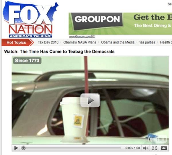HERE'S THE screengrab. Let teabaggers never whine again about being called "teabaggers," a natural name they were given in their early days, when actual, physical tea bags were their main weapon. Also, they liked to put their filthy unwashed balls into each others' mouths. A good time was had by all. Now, according to some video that may or may not be affiliated with anything, they are admitting this.