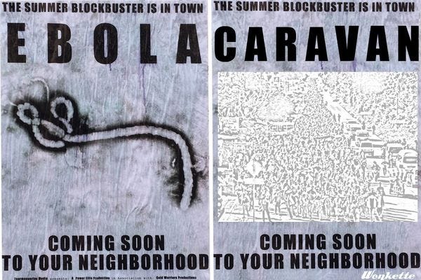And then the midterms happened and the Ebola "crisis" vanished, right along with all those bagel-munching ISIS terrorists in Texas, to be stored away until needed again, like this week , because hey, what if GEORGE SOROS is funding the caravan? Duh, he's not, but it's fun to say, isn't it?