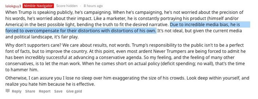 In any case, it's not like Trump fans care if he lies. As Yr Wonkette's own Robyn Pennacchia found on the AskTrumpSupporters subreddit, trump HAS TO lie to counteract all the lies in the media, which is simply Good Logic: