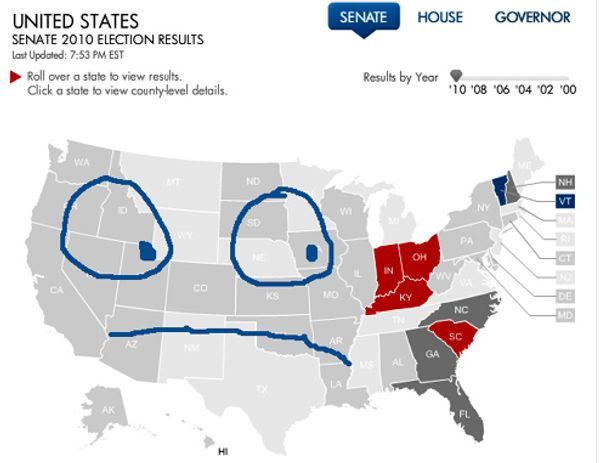 8: 30 PM -- The second Senate pickup for Republicans: Arkansas polls just closed and Blanche Lincoln lost.
