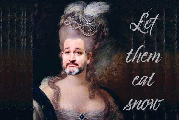 The first graf is dumb. "The greatest state in the greatest country in the world has been without power," he says, without noting that it's happening because the Texas GOP made it that way. Cruz says his own family lost heat and power, in their very nice house. They're just like you!