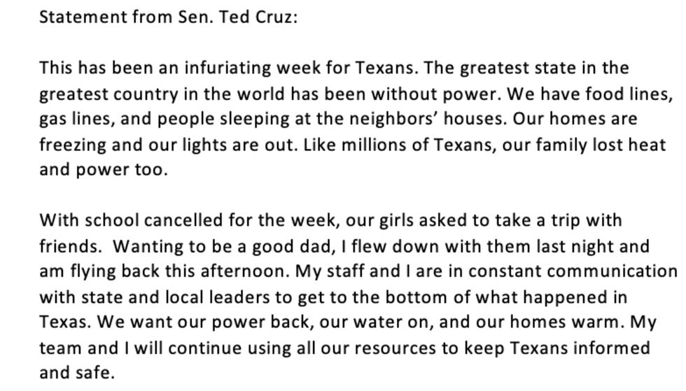 We were about to write a post about the worst rightwing pundit reactions to Ted Cruz's little topless Mexican "Cruz Gone Wild" adventure, while the state he represents literally freezes to death. Then the senator himself released a statement:
