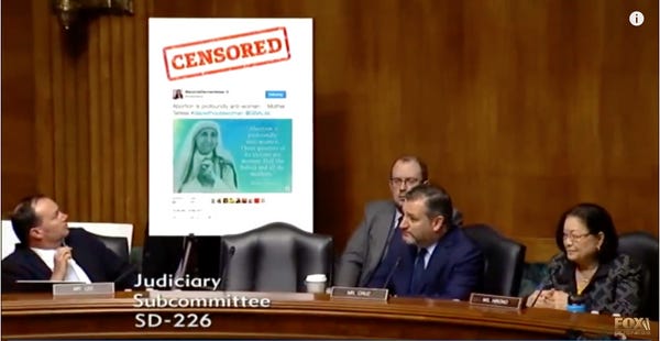 Ted Cruz: Here is one example of a conservative having a post taken down on Facebook and/or Twitter. Do you mean to tell me that this does not absolutely prove that Facebook and Twitter are biased against conservatives? Is it not true that you have never taken down any post by any Democrat ever?