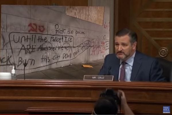 Cruz solemnly quoted the graffito pictured up top, since he figured it was antifa's mission statement: "Until the Police and ICE are abolished, we will burn this city down piece by piece."