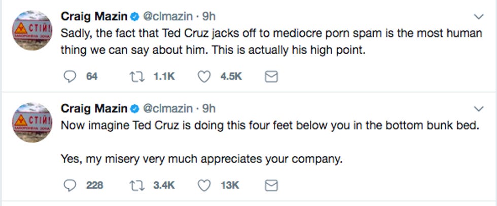 Last night, while I was kind of half asleep and watching True Blood, a miracle happened on the internet. Ted Cruz, or whoever was managing Ted Cruz's Twitter account in the middle of the night, liked a porn video (link NSFW!). On Twitter. From the account Sexuall Posts, with two Ls. Where everyone could see. Everyone, it seems, had a very good time, and I am very sad that I missed it.