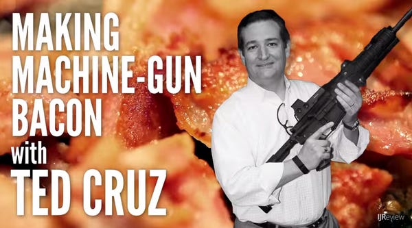 "In Texas," says Canadian-born Cuban Ted Cruz, "we cook bacon a little differently than most folks." How's that, you're not even wondering, but he's gonna show you anyway. See, whileotherAmericans might cook bacon the lazy way -- on the stovetop or in the oven or maybe even the microwave -- Texas-Americans drive to their favorite local gun range, wrap strips of bacon around the barrel of a machine gun, POW! POW! POW! at a target until the bacon grease collects in a pool on the ground, and voila! It's both an efficient and hygienic way of enjoying the cornerstone of any healthy breakfast.