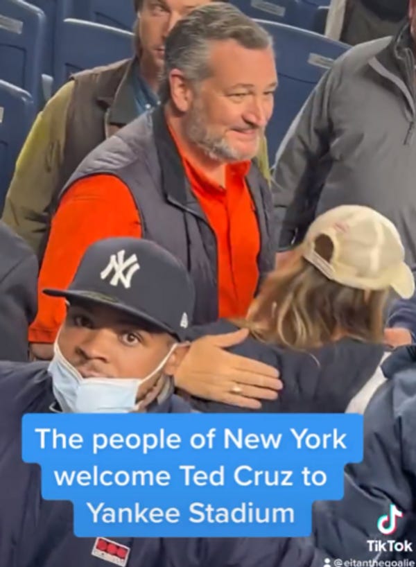 So yeah, the Yankees fans were just real mean to Ted Cruz. They flipped him off a bunch. They booed him. They told him to go back to Cancun.