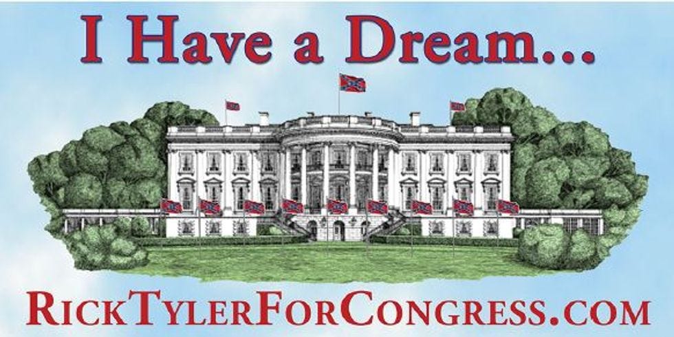 Meet Rick Tyler! Rick Tyler is running for Congress in Tennessee, and he has A DREAM. He is also A IDIOT. Because that dream is to "Make America White Again," which is a dream for jerks. His other dream is to plaster the White House with confederate flags, which, also, is a dream for jerks. And traitors! And very tacky people, to be honest.