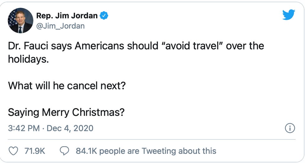 Americans don't treat doctors with the blind reverence they reserve for the police, probably because doctors take an oath against killing people. This means Republicans are free to pick fights with doctors. Ohio GOP Rep. Jim Jordan has implied Dr. Anthony Fauci is a Grinch who wants to steal Christmas because he's begging people stay put over the holidays.
