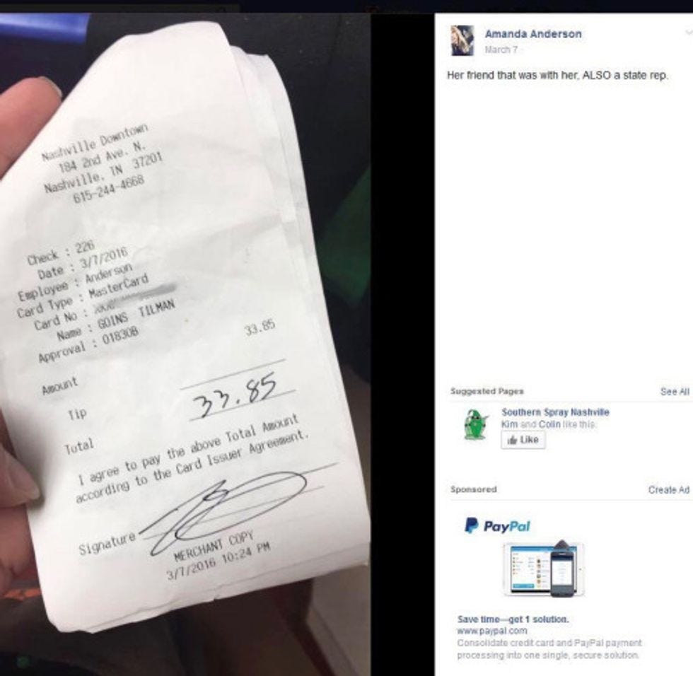 But what we're having trouble envisioning is the specific scenario where it's also appropriate or even logical to write "Sorry" on the tip line. Littleton can't claim she didn't have the money to tip, because Tennessee lawmakers get a daily spending allowance of $204 provided by the taxpayers. (In one of the universe's more dickish ironies, Anderson actually used to be one of Littleton's constituents.) Not that "Sorry, I didn't have enough money to tip you" would be a viable excuse even if it was true.