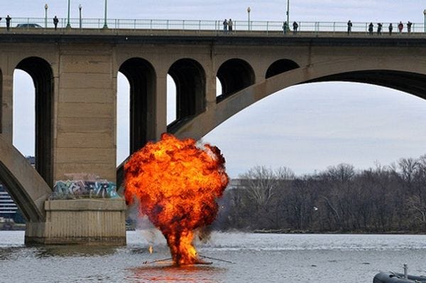 Here is an image of the much-anticipated explosion on the Potomac River today that was filmed for some new teevee pilot. It was still confusing to D.C. residents even though they had been alerted beforehand, because why the fuck is a rowboat being blown up? Should be a real winner of a show, although Obama will probably just preempt it every night to read more lies off of his Tellyprompter. [ Flickr ]