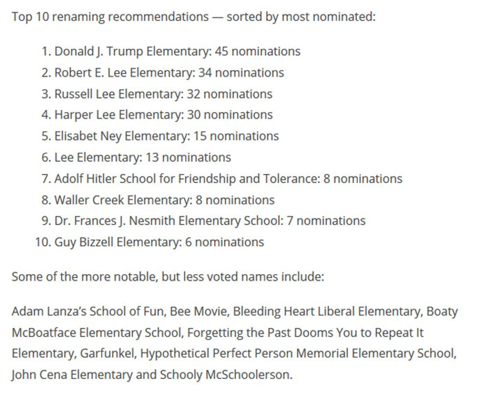 In an attempt to get "community buy-in" on the name change, the school district gave locals the opportunity to nominate new names. And then the Internet happened to it. The list of top nominations was released Friday: