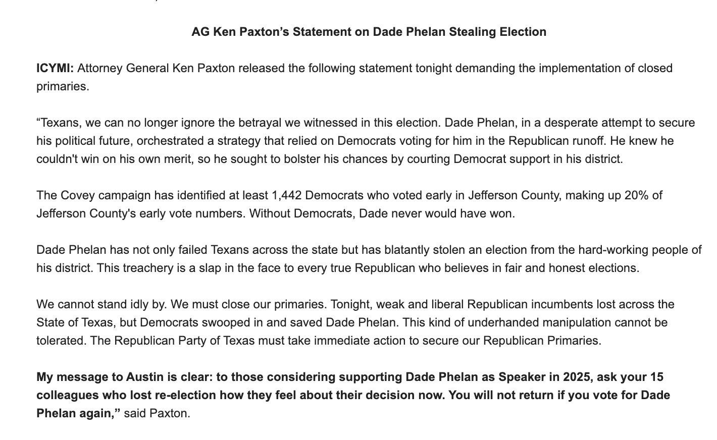 “My message to Austin is clear: to those considering supporting Dade Phelan as Speaker in 2025, ask your 15 colleagues who lost re-election how they feel about their decision now. You will not return if you vote for Dade Phelan again.”