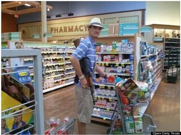 You might be surprised to discover that Texas doesn't require gun owners to obtain a gun license, register their guns, or report when their guns are lost or stolen. It does allow people to carry rifles and shotguns openly, and it allows gun owners to carry any kind of gun in public as long as it is concealed, but it does NOT allow the open carry of handguns. Gun regulations being a sort of endangered species in Texas, gun groups can hardly be blamed for their excitement in finding a healthy, robust specimen to kill and mount on the wall of their hunting lodge.