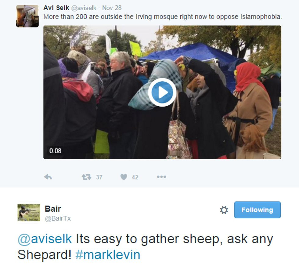 [contextly_sidebar id="9Byx9hpMKdBkDxj300KIZTINCQzUtTsh"]A week ago, a dozen or so very brave Texas Super Patriots proved how much they love America by standing around with guns outside a mosque in the city of Irving, to warn about the impending cataclysm of Sharia Law taking over the state. Several of these courageous souls wore masks and gave reporters only pseudonyms, to protect their identity from The Enemy. To follow up on that act of America-defending, the group's leader, one David Wright III, posted the names and addresses of "Muslims and Muslim Sympathizers" in town, just in case anyone needed to know, or might be driving around with a Molotov cocktail they needed to dispose of.