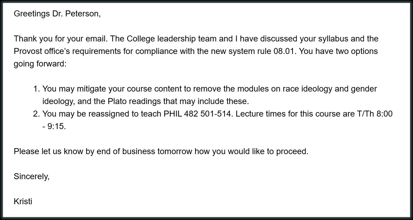 Dr. Peterson shared the warning from his department chair, Dr. Kristi Sweet, which passed along the verdict of the College of Arts and Sciences’ “leadership team,” which vets course syllabi for compliance with “Rule 08.01,” the University’s ban on allegedly illegal knowledge, in keeping with executive orders from Donald Trump and Gov. Greg Abbott. Sweet informed Peterson that if he didn’t scrap the gender and race module, he would be assigned to teach another introductory philosophy class, “Ethics and Engineering,” and no we are not making that up.