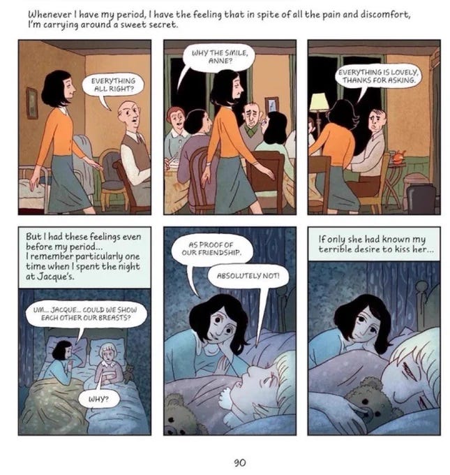 Again, it’s not clear how much of the adaptation the class read, or what the lesson plan was; based on a parent’s comments as reported by KFDM, the assignment that got the teacher fired appears to have included the diary entry for January 6, 1944, in which Anne wrote about getting her period and “feeling that in spite of all the pain and discomfort, I’m carrying around a sweet secret.” In the same entry, she recalled suggesting to a friend that they show each other their breasts as proof of their friendship (kids are weird, in the 1940s and in 2023). After the friend said “absolutely not!” Anne wrote “if only she had known my terrible desire to kiss her.”
