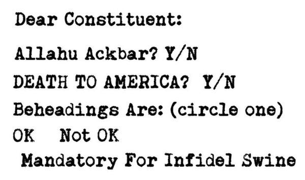 A bit later, the office sent a more specific written statement, explaining, "The poll that went out was paid for with private funds and was sent out to gather responses in advance of my upcoming Homeland Security Summit[.]" Private funds, so don't you go worrying about any official harassment of Texas Muslims, you sillies, even though the envelopes were marked "URGENT REPLY ASAP" and sent by a state representative. The Tribune notes that other participants in Biedermann's little bigot party include representatives from "the American Islamic Forum for Democracy" and "Former Muslims United," which do not at all sound like Islamophobic shell groups bent on promoting Islamophobic paranoia.
