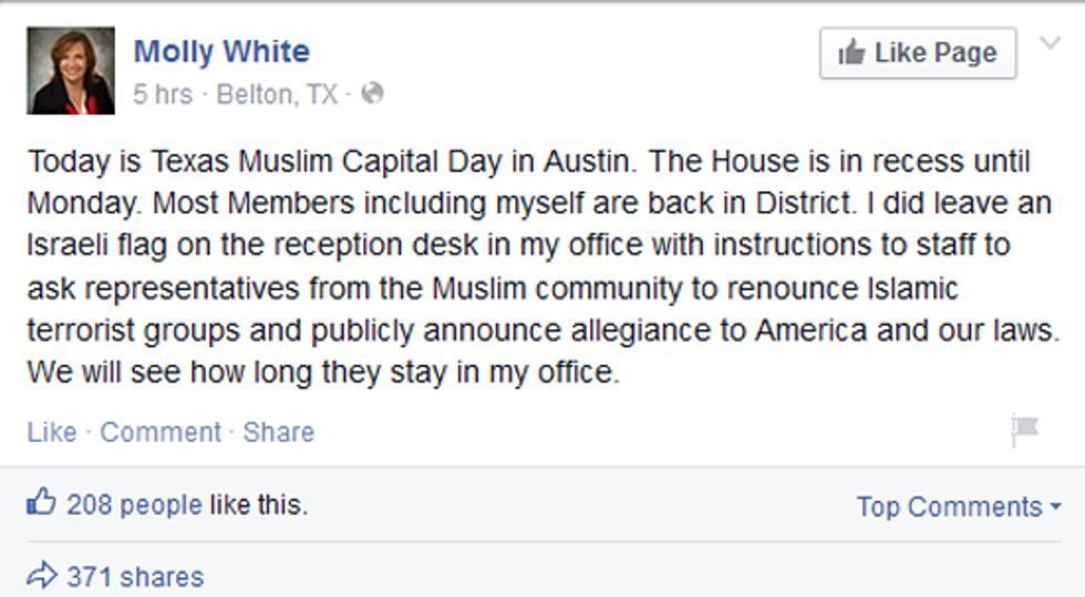 Oh, boy, it's almost time for Texas Muslim Capitol Day again, that biennial event where the state's Muslim citizens are invited to come on down to the Pink Dome in Austin to learn how their state government works, how to be effective citizen lobbyists, and to be screamed at by crazy people who fear that energy drinks are full of SATAN (and Sharia, same thing). You might recall that a couple years back, state Rep. Molly White marked Muslim Capitol Day by vacating her office altogether but putting any Muslim constituents on notice that if they wanted to meet with her, they'd have to "pledge allegiance to American Law," renounce terrorism, and say hi to the Israeli flag on her desk: