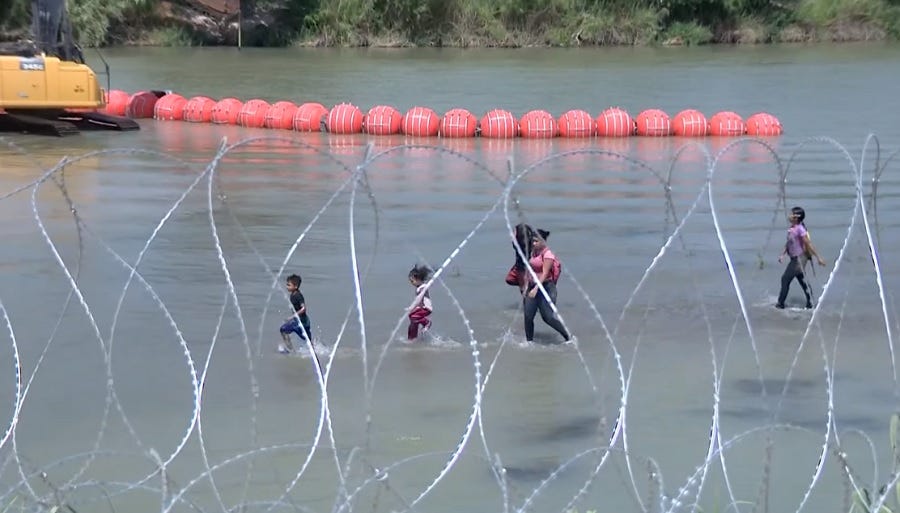 As part of his effort to make undocumented immigrants just go away forever so he can become president, Abbott has recently installed long strings of “deterrence buoys” in the middle of the Rio Grande, along with miles of razor wire along the banks. The buoys are installed along some of the areas that are relatively easy to cross, leading some migrants to try crossing more dangerous sections of the river. Mexico has complained that the buoys violate a treaty between the US and Mexico, as if that mattered.