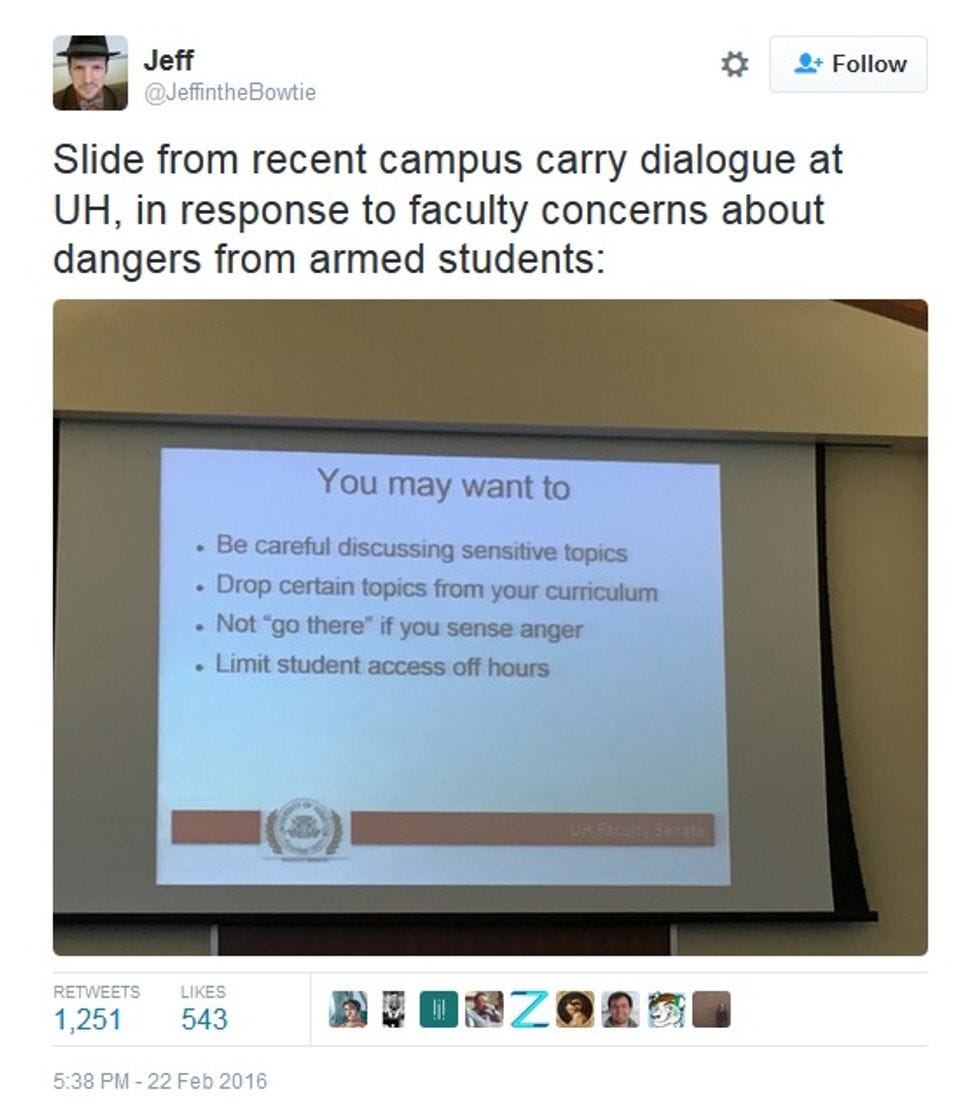 Protip: If you're paywalled out of the Houston Chronicle article, simply google the headline "UH faculty suggest steering clear of some topics if students armed"