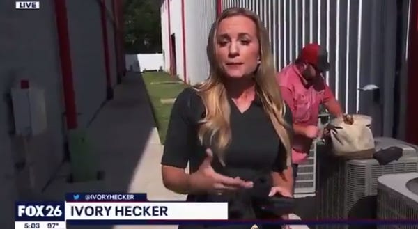 Ivory Hecker is (was?) a news reporter at Houston's Fox affiliate, Fox 26. Ivory Hecker was supposed to say a report about "heat wave." Instead Ivory Hecker said she is gonna EXPOSE the CENSORSHIPS at FOX — no, not Fox News, Fox 26 — and that she "found" a very integrity-filled group of journalists to help her do this. That's right, she is a secret Project Veritas operative!