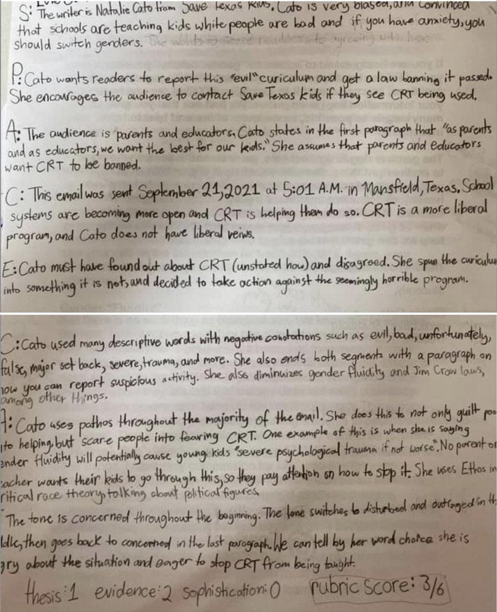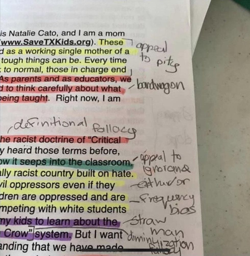 Happily, Daily Beast contributor Steven Monacelli was able to get a copy of photos of parts of the rhetorical analysis assignment that had been attached to the second email. This is good stuff! The rhetorical strategies and logical fallacies are highlighted and labelled; for instance, the line "the racist doctrine of 'Critical Race Theory'" is identified as a definitional fallacy, because calling CRT "racist" already prejudices the reader against CRT. It's not clear whether that's the teacher's writing, or the student's; we suspect it's the student based on the example that follows.