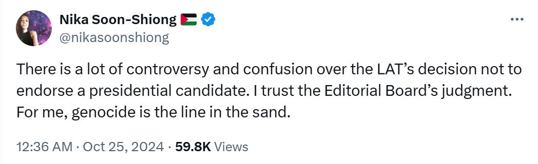 Progwashing her billionaire father’s decision to unendorse Kamala Harris, thereby making an implicit equivalency between Harris and Trump, by invoking Gaza? And then implying the Editorial Board did it? Who is lighting all this gas?!