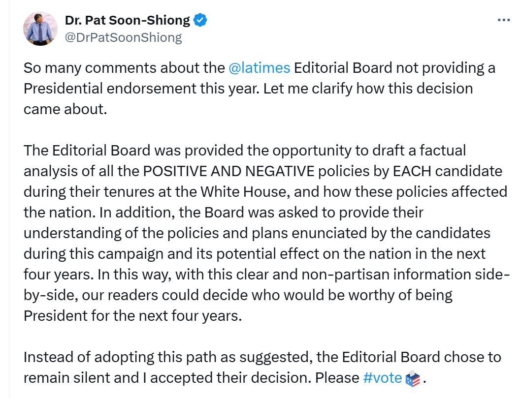 Regrettably — very regrettably — the Post is the second major American newspaper this week to see ownership spike a presidential endorsement. On Tuesday the owner of the Los Angeles Times, Patrick Soon-Shiong, announced that he had also prevented his paper’s editorial board from endorsing a presidential candidate. He tried to explain himself on X: