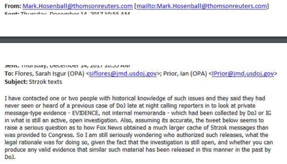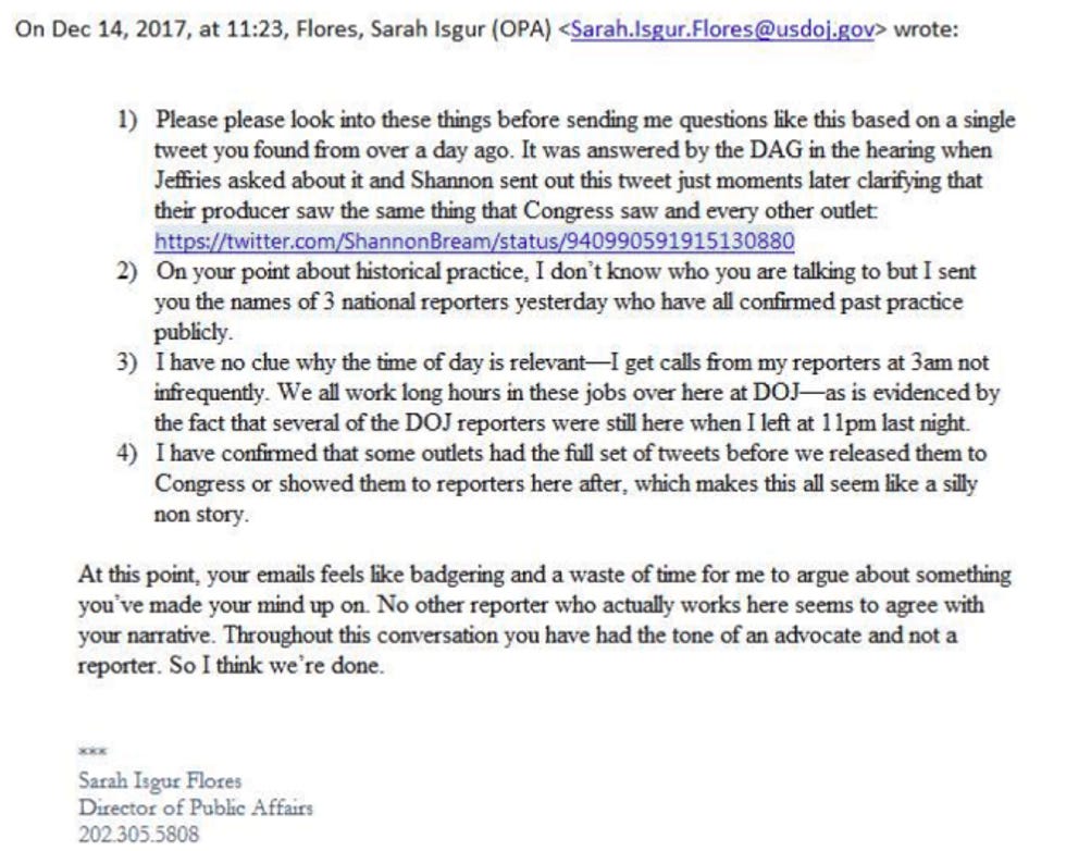 Nor was Isgur's snarking that Hosenball's question had been "answered by the DAG in the hearing" entirely on the up and up. In response to a query from Rep. Hakeem Jeffries about how reporters got Page and Strzok's texts before the hearing, Deputy Attorney General Rosenstein said, "We consulted with the inspector general to determine that he had no objection to releasing the material. If he had, we would not have released it." Which was, not to put too fine a point on it, A LIE.