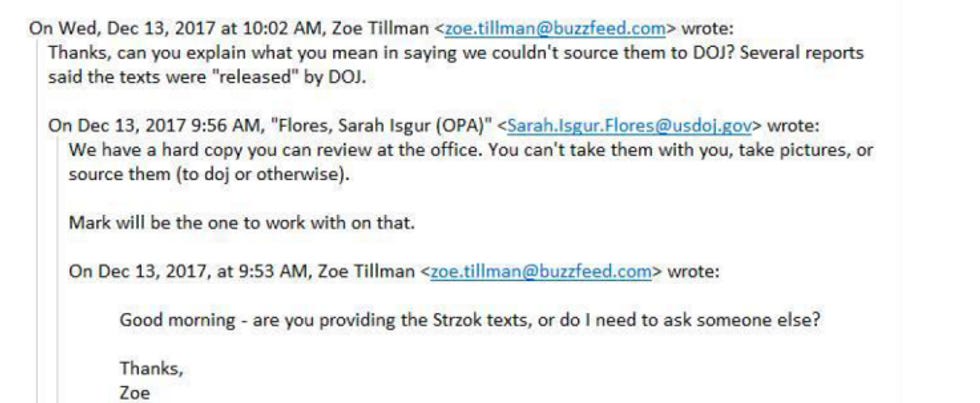 The DOJ had already delivered the entire batch of 10,000 texts to the House and Senate Judiciary and Intel Committees, and the RNC had already gotten their hands on them somehow . But to ensure widest distribution before Rosenstein's December 13 appearance on the Hill, Isgur invited the media in for a sneak peek, off the record.