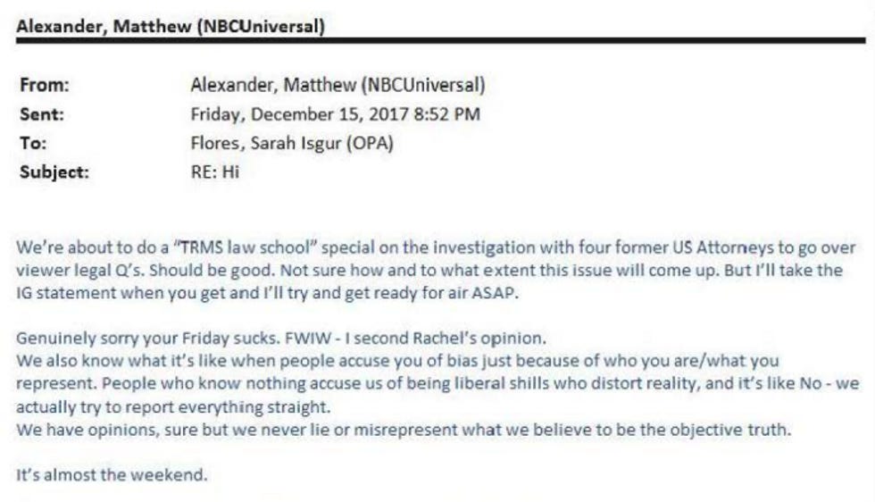 And yet, less than a year into the Trump administration, the entire DC press seemed willing to play along with the game. Here's Matthew Alexander of NBC Universal tartly sympathizing with the drubbing Isgur took after Bertrand broke the story of Isgur's late night machinations, because, "We also know what it's like when people accuse you of bias just because of who you are/what you represent."