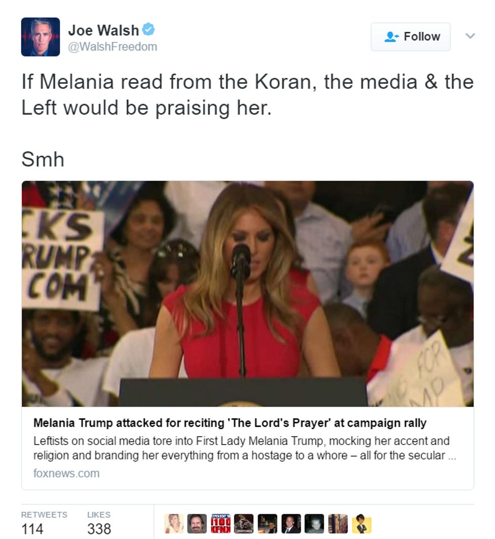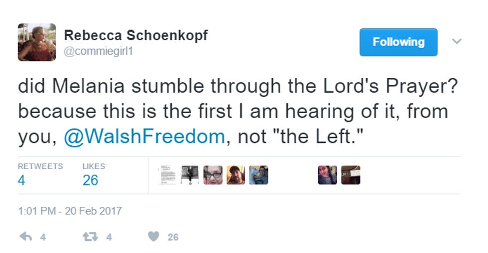 We're convinced! The Fox News link in Walsh's first tweet is here, and surprise, it is a few randos on Twitter saying snarky things. FEEL THE OUTRAGE! Twitchy appears to have assigned at least six and a half of its NINE PAID STAFFERS to find other randos being mean on Twitter. The stupidest man on the internet, Jim Hoft, also reported that liberals were "TRIGGERED AND OUTRAGED" by Melania's praying. Personally, we, yr rabid frothing liberals, didn't even hear about this until these two dorks started whining about it: