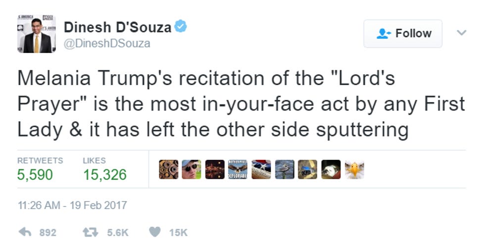 Dinesh? Joseph? Stop being such fucking pussies. A few people on the internet tweeted some things, some of them pointing out that Melania was totally pandering, since we're all pretty sure the Trumps, who were sent by baby Jesus to save America, are not remotely Christian people. This is a valid observation! Sorry if it hurts to hear it, but we highly doubt either Donald or Melania actually gives one solitary fuck about Jesus. And we are saying that without sputtering or outrage! We may be smirking just a little bit, because we are total dicks.