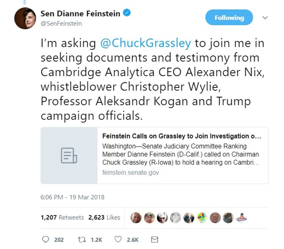 Other senators demanding Mark Zuckerberg's ass on a platter include Mark Warner, Ron Wyden, John Thune, Roger Wicker and Jerry Moran. Oh, and Dianne Feinstein seems pissed: