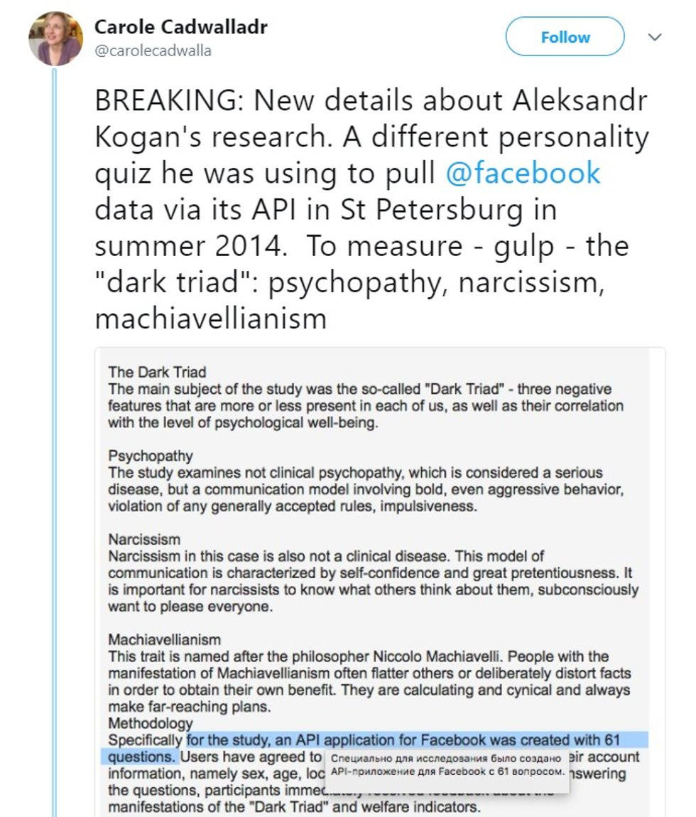 Keep your internet tuned to Cadwalladr's Twitter feed for all the latest breaking news about Cambridge Analytica, how Facebook is currently acting like A BIG ASS about this, and also this weird thing about what else CA's Kremlin-connected Russian "researcher" was "researching":