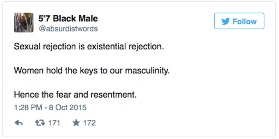 That is a part of it, too. Hell, part of the reason that we have Trump as president is because a bunch of white men were angry about things they felt entitled to being taken away. They felt entitled to have people laugh at their rape jokes, to say rude things to people and not have those people get offended (or, more specifically, not like them because of it ), to have video games be a boys only club, to spread their legs out on public transportation without consideration of the fact that they might be making the person next to them uncomfortable, to have to consider whether the woman fucking them actually wants to be fucking them. At the end of the day, that is what all of this has been over. Male entitlement, specifically white male entitlement, and fear of rejection is fucking us all.