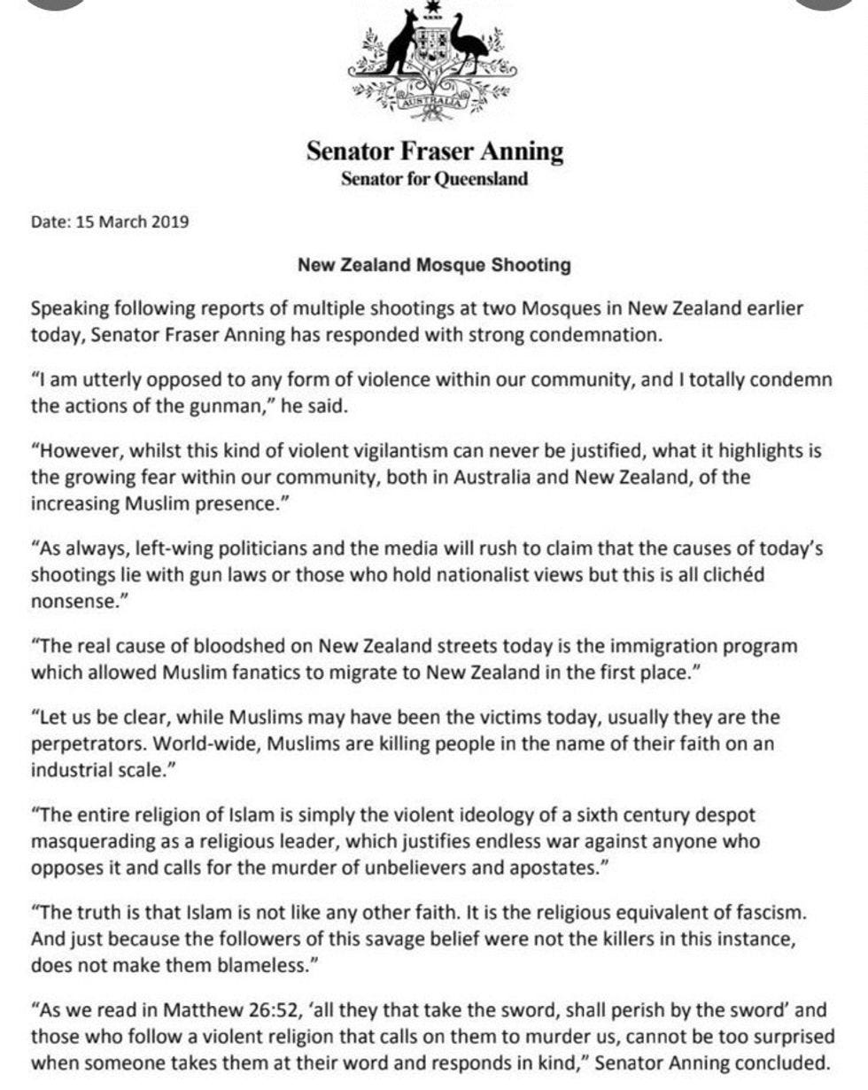 But perhaps the most WOW reaction of all came from a lawmaker from Australia, that bastion of multi-culturalism and harmony (WE KID!). His name is Fraser Anning, and he just went straight past thoughts 'n' prayers and right into blaming the Muslim victims for their murder, because Muslims are evil: