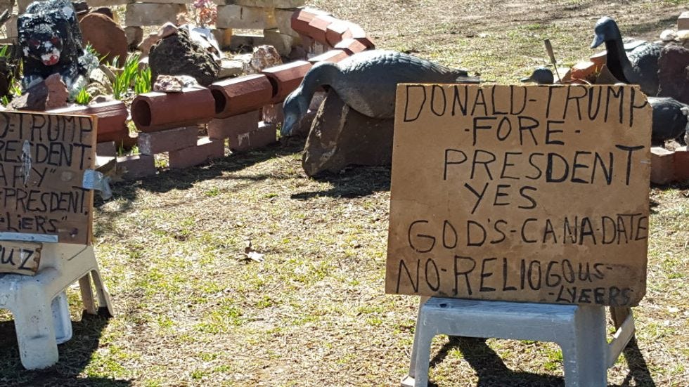Average number of words spelled correctly per lunatic Oklahoma outsider artist's front yard Trump signs: 1