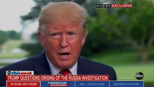 Kudos to ABC News for drip-drip-dripping out George Stephanopoulos's batshit interview with President Batshit as slowly as possible, for maximum effect. We really did need a few days to absorb the president saying it was totally OK for hostile foreign powers to help him win in 2020. (Which happens to be exactly what they did in 2016, according to the Mueller Report, the contents of which Trump is now lying about more brazenly than he was just last week, as you'll see below!)