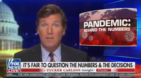 Tucker Carlson chimed in after Brit Hume's conspiracy-mongering to say that some people may "seek an inaccurate death count" from coronavirus, and you know who he means (it is the Deep State Fake News).