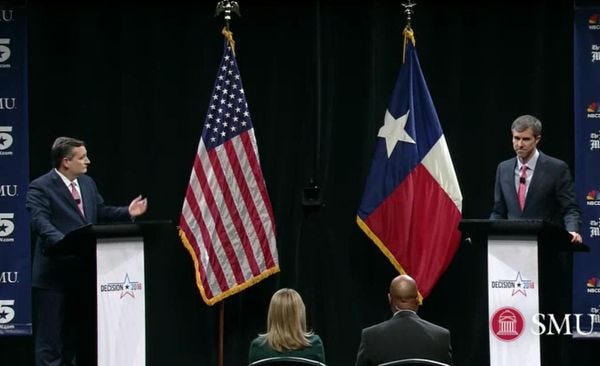 At the end Beto and Cruz were forced to say nice things about each other. Beto said he and Cruz were ideologically different, but he admired Cruz's dedication and thanked him for his service. Cruz replied with a half-assed ditto, and noted that it's nice how Americans no longer lynch filthy negro-loving commies like Beto O'Rourke. " True to form," Beto quipped.