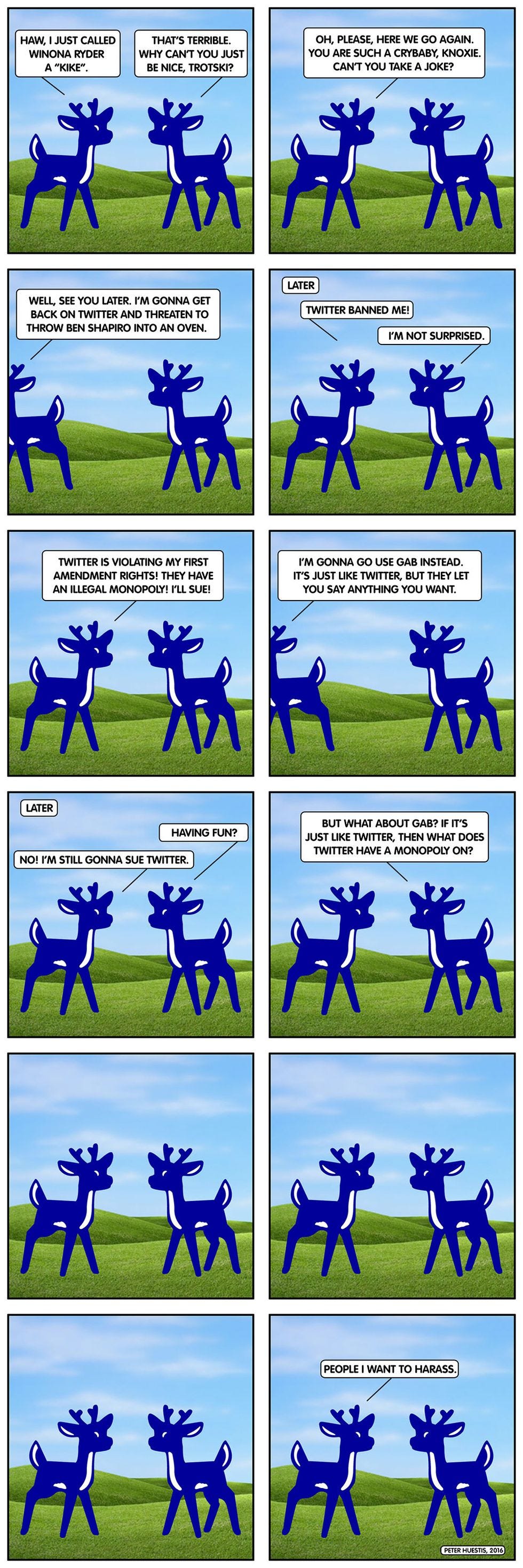 We've heard a lot lately about foul alt-racists being banned from Twitter, and that makes them very angry! Luckily, they've got their own safe space, Gab, where they can racist all they want. So if if all the Milos and Chuck Johnsons and Matt Forneys love Gab so much, and hate Twitter so much, they should be happy, right? Wrong! Why is that? Let's enlist adorable cartoon deer to explain it for you.