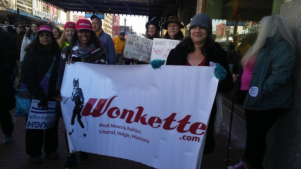 But we can have their backs -- the 88-year-old man on the train whose sign said OLD PEOPLE VOTE EVERY SINGLE TIME, and all the middle-aged mothers like me, and the husbands who cherish their children but for real, not like how Donald Trump "cherishes" a woman. And there are so many of us, so many millions, and we will vote, and we will end our nation's insane bloodlust at the ballot box. I have never felt more hope and joy -- okay, the morning after Obama's election, but that's the ONLY time in my 45 years when there was such a clarity of goodness in our nation's collective heart.