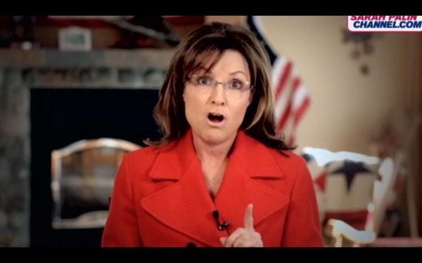 Exactly 24 hours later, the Sarah Palin Channel published a second video. In the second video, the Governor is wearing the same red blazer in front of the same fireplace, only this time, the Dread Tyrant Obama seems a little, we don't know, softer? More dad-jeansy? It seems the Kenyan despot was poised to ban one particular type of armor-piercing ammunition, but then America's gun-humping citizen-patriots rose up.