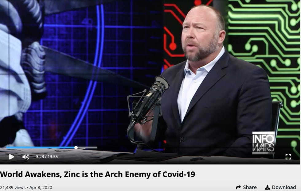 Of course, just because Jones isn't selling his colloidal silver products anymore, that doesn't mean that he's not pushing other bullshit. Just two days ago, Jones claimed that the only people who were dying of COVID-19 were people with zinc/vitamin C deficiencies.