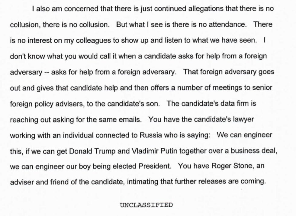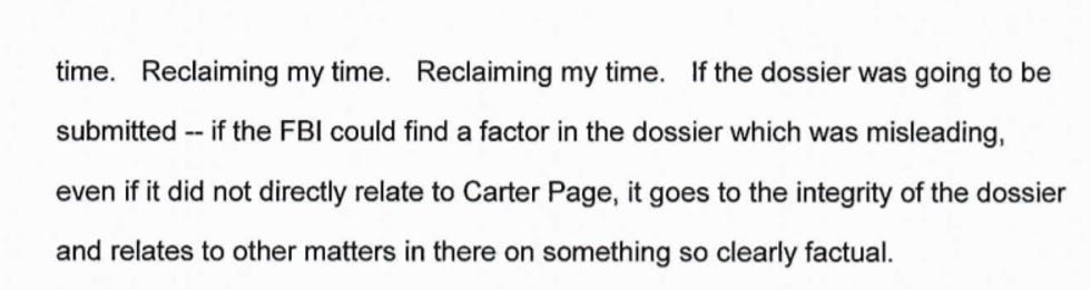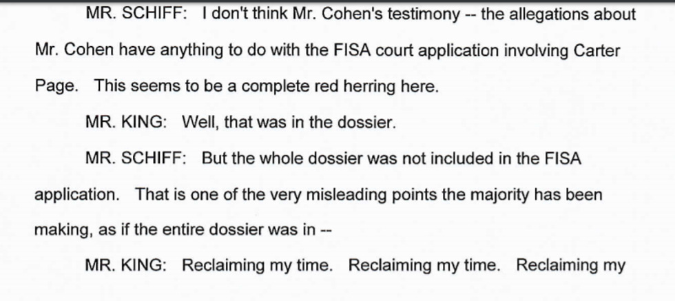 SCHIFF: But your stupid memo was about how the FISA court somehow improperly approved multiple FISA warrants against Carter Page The Literal Actual Russian Intelligence Asset, because dossier information was included amongst MULTITUDES OF OTHER INTELLIGENCE in that FISA application.