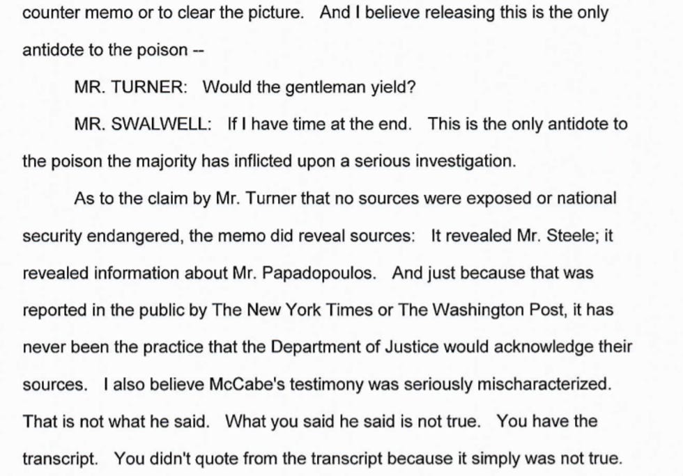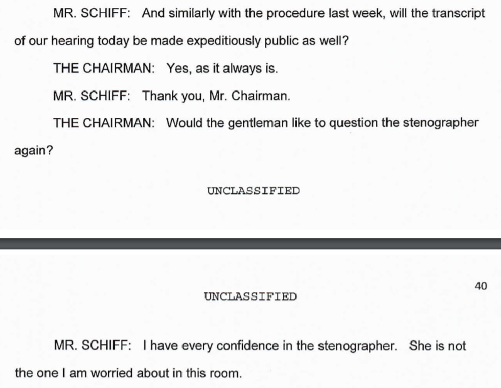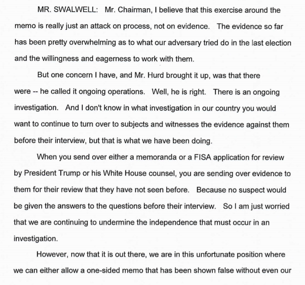 On Monday, the House Intelligence Committee (HPSCI) held a hearing to vote on releasing the Democratic response memo, the one that takes a big red pen to the Republican memo and shows which parts are bullshit (all of it), according to not only the Democrats, but also the FBI and the Department of Justice. They voted that yes, it should be released, for transparency! And they released the transcript of their hearing today, for super transparency!