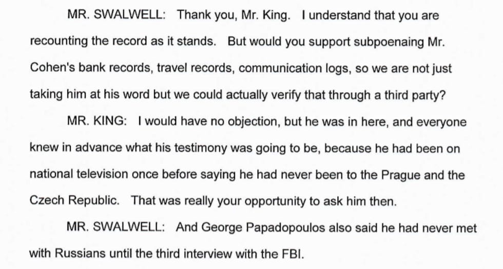 In this section, GOP idiot Peter King says UH HUH the DODGY DOSSIER has been disproven, because Trump asshole lawyer Michael Cohen says he wasn't in Prague meeting with Russian agents when the DODGY DOSSIER said he was. In response Democratic Rep. Eric Swalwell is like "Cool story, bro. I fuckin' DARE Y'ALL to subpoena his records, instead of just taking his word for it."